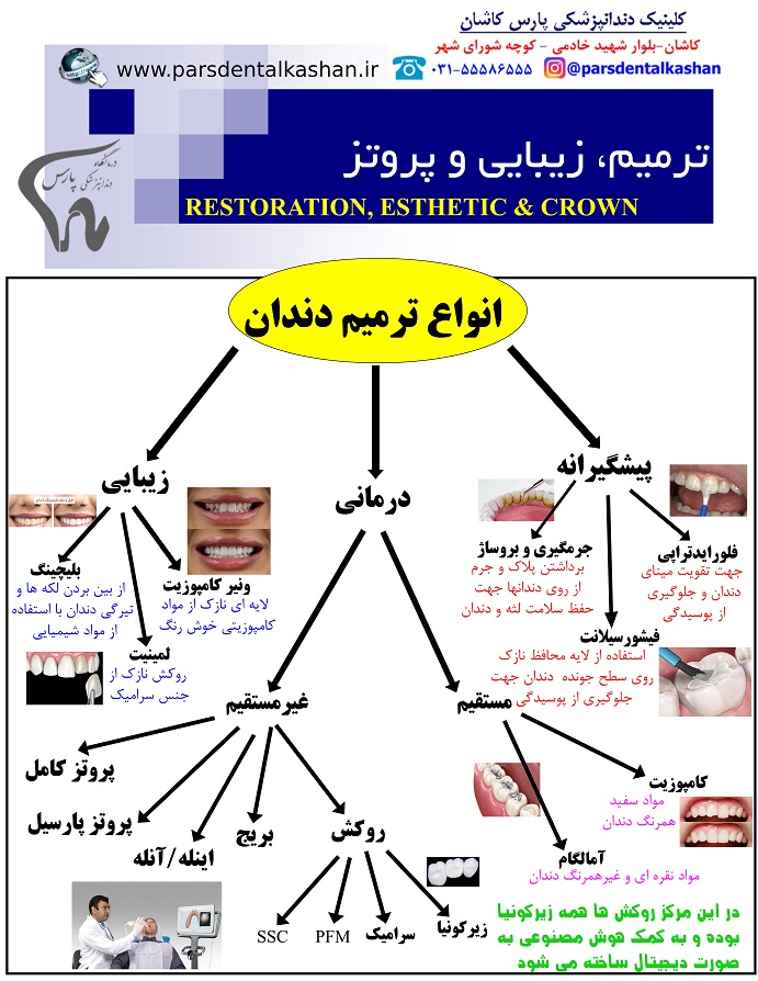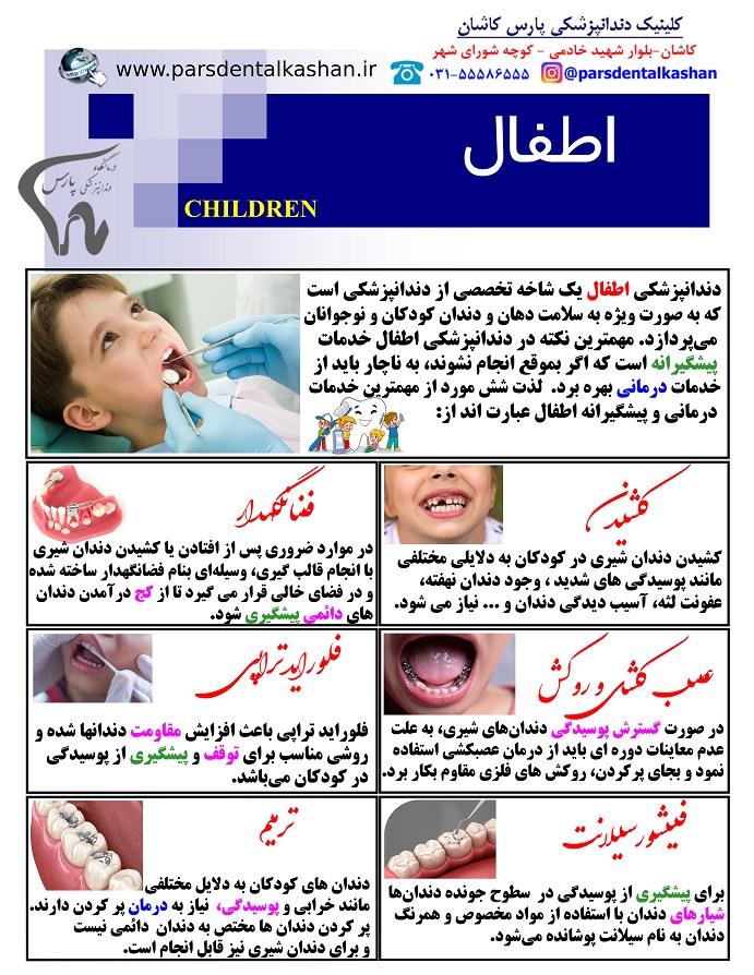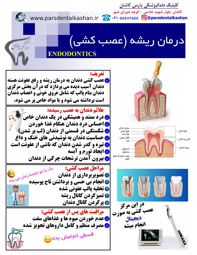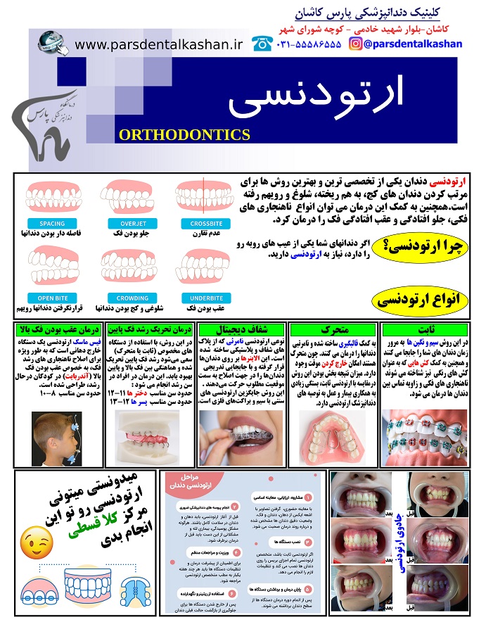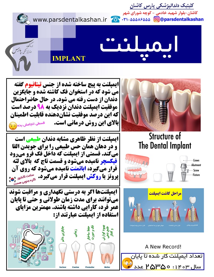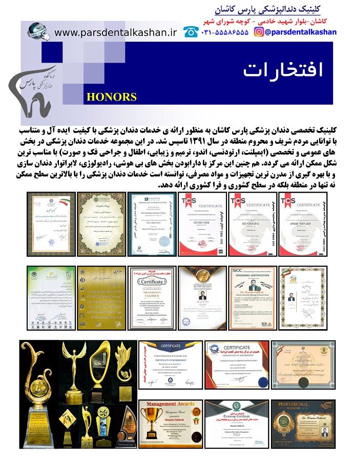 کلینیک تخصصی دندان پزشکی پارس کاشان به منظور ارائه ی خدمات دندان پزشکی با کیفیت ایده آل و متناسب با توانایی مردم شریف و محروم منطقه در سال 1391 تاسیس شد. در این مجموعه خدمات دندان پزشکی در بخش های عمومی و تخصصی (ایمپلنت، ارتودنسی، اندو، ترمیم و زیبایی، اطفال و جراحی فک و صورت) با مناسب ترین شکل ممکن ارائه می گردد. هم چنین این مرکز با دارابودن بخش های بی هوشی، رادیولوژی، لابراتوار دندان سازی و با بهره گیری از مدرن ترین تجهیزات و مواد مصرفی، توانسته است خدمات دندان پزشکی را با بالاترین سطح ممکن نه تنها در منطقه بلکه در سطح کشوری و فرا کشوری ارائه دهد. امید است رضایت شما هم میهنان عزیز را نیز به همراه داشته باشد.